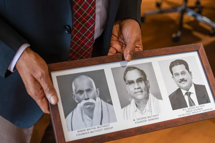 George Alexander Muthoot shows photos of Ninan Mathai Muthoot, founder, left, M. George Muthoot, founder of banking, center, and M.G. George Muthoot, group chairman at the company's headquarters in Kochi, in October.