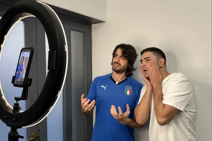 Matteo Salvatori, 32, and Emiliano Santoro, 32, better known as the duo Lionfield, film a YouTube clip at their studio in Campoleone for their show as the global “pasta police” — calling out culinary crimes against Italian food.