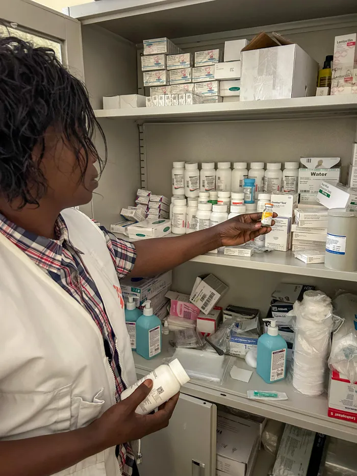 An MSF midwife supervisor organises medicines given to sexual violence survivors at their first medical appointment at Turunga Health Centre, Goma, DRC. She holds post-exposure prophylaxis for HIV, administered to survivors within 72 hours of the assault.