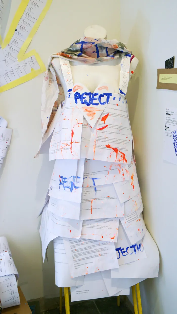 She combined all the rejection letters she’s received in her life - jobs at coffee shops, art galleries, art residencies and exhibitions to which she wasn’t accepted - and fashioned them into a dress. There are about 50 rejection letters, and Ariel painted the word “reject” on a heart at the top of the dress.