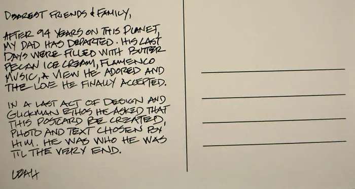 “In a last act of design and Glickman ethos, he asked that this postcard be created, photo and text chosen by him,” the note continued. “He was who he was ‘til the very end.”