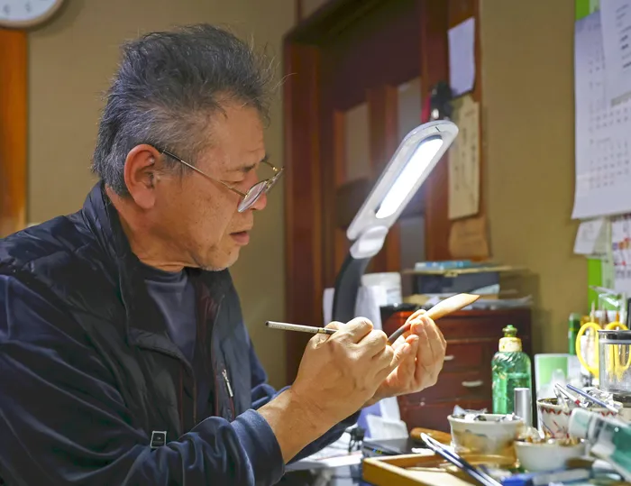 Satoshi Kiso, a Wajima lacquerware artisan from Nonoichi, Ishikawa Prefecture in Japan, applies lacquer to woodworks delivered by Shinichi Endo.