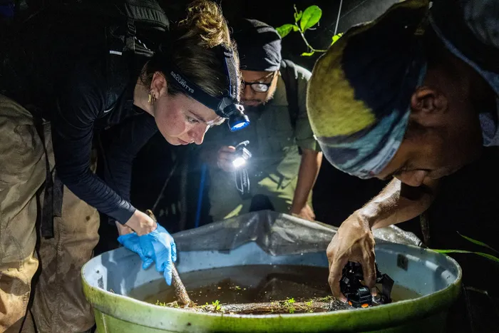 Conservation scientists Julie Dogger, Oliver Granucci and Orlando Garces check on tadpole development in the national park.