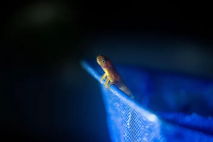 A metamorphosing lemur leaf frog tadpole hangs on the edge of Dogger’s net.