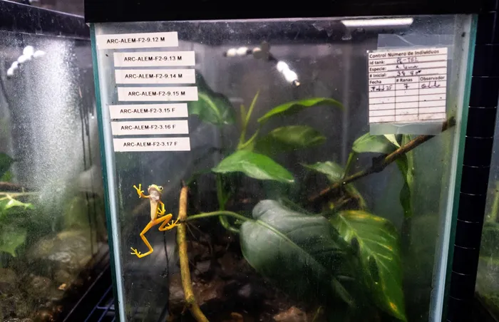 Lemur leaf frogs are grouped in a breeding tank with multiple males and females at the Panama Amphibian Rescue and Conservation Project.