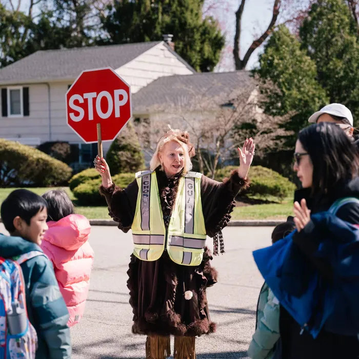 Her job as a crossing guard starts at 7:15 a.m., but every morning she wakes early to assemble her elegant outfit and apply a coat of lipstick. In winter, she wears fur boots and full-length fur coats; in spring and fall, shawls or capes - all topped with a bright-yellow reflective vest. She always finishes the look with an ornamental hat, which she calls her “chapeau.”